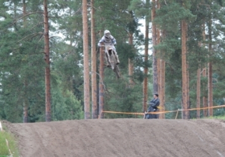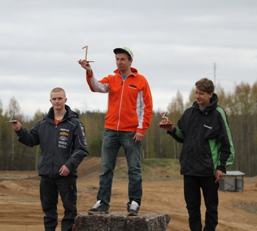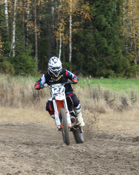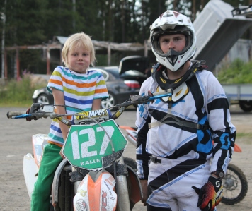 ![]() Sunnuntaina olikin sitten vuorossa Kallen ensimmäinen kisa 250 kuutioisella kaksitahtisella B-luokassa. Tämä pyörä onkin erityisesti Kallen mieleen ja tällä ajetaan monia treenejä. Aikaajot ja alkuerä lupailivat hyvää finaaliin, sillä tänään kisaan oli lähdetty lauantai unohtaen. Finaalissa Kalle kävi kovaa kisaa Parkkisen Nikon kanssa, joka pääsi hieman karkuun lähdössä. Kierros kierrokselta Kalle kuitenkin ajoi kiinni Nikoa. Kallen ohitusyritys viimeisellä kierroksella jäi yritykseksi. Maaliin Kalle ajoi toisena hyvän ajon ajaneena.