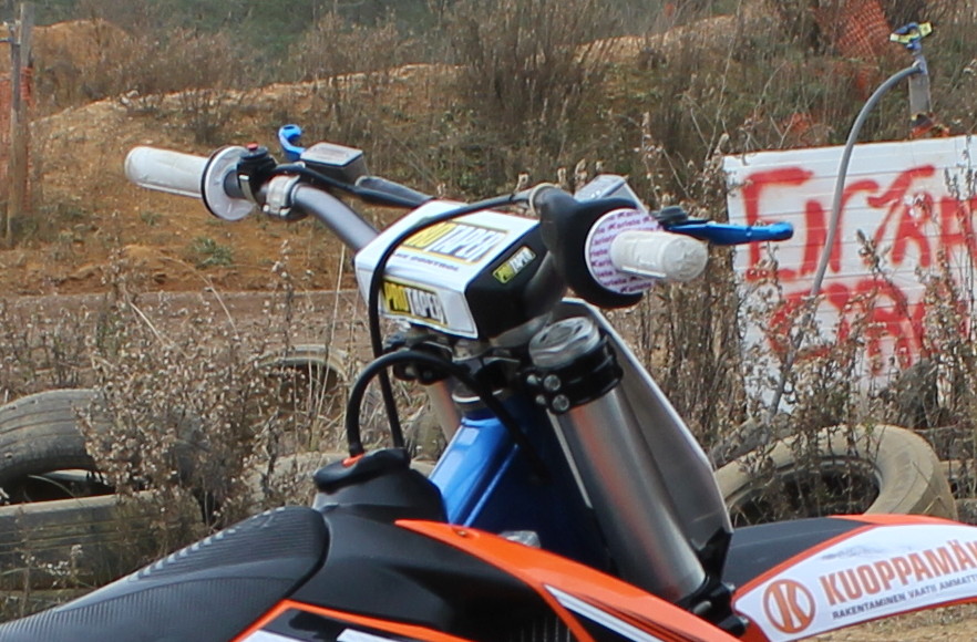 Syy kaasun hirttämiseen on hieman erikoinen. Käytämme Protaper Fat bar -ohjaustankoa. Kuten kaikissa muissakin, pehmuste on melko kapea ja paksu neliskanttinen vaahtomuovin pala keskellä tankoa. Ktm :ssä kaasuvaijeri menee tangon ja tankin välistä kaasukapulaan. Ei siis niin kuin yleensä, tangon ja numerokilven välistä. Huonon tuurin sattuessa on mahdollista että, vaijeri jää vasemmalle puolelle pehmustetyynyn taakse lukkoon niin että, kun kääntää tangon suoraan, pehmuste vetää kaasun täysille. Tämän estämiseksi meillä on ollut nippuside rajoittamassa vaijerin liikettä em. tilanteen estämiseksi. Nyt nippuside puuttui ja pahin tapahtui. Protaperilta oli mukaamme tullut parempi malli pehmusteesta ja sen me otimme käyttöön. Pehmuste on hieman leveämpi kuin vanha ja muotoilukin pienentää edellä kuvatun tapahtuman mahdollisuutta. Laitoimme kuitenkin nippusiteenkin. Käsi turposi nopeasti, onneksemme turvotus laski yhtä nopeasti. Kipukin alkoi helpottaa, kun sidoimme kipeän etusormen keskisormeen. Kalle ei ajaessa tarvitse vasenta etusormea muuhun kuin kytkimeen. Heti torstaina päätimme kokeilla kuinka pystyy ajamaan. Hyvin näytti sujuvan ja vielä hyppyri-rikkaalla Sant Celonin radalla. Kalle ajoi täydet setit, ehkä ilman kytkintä?:)