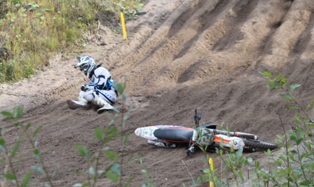 Toisen erän startti oli loistava ja Kalle pääsi matkaan toisena. Kalle arvioi ohituspaikan hieman väärin. Kolmannella kierroksella juuri kuralammikossa ohitus ei onnistunut vaan Kalle kellahti rataan. Näin kisa jäi tällä kertaa siihen.